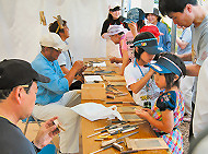 常呂川自然教室を開設し、葉っぱのスタンプ体験、水のオリンピック、自然体験ゲーム&香りメール(はがき)作りに150人が参加しました。