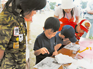 常呂川自然教室を開設し、葉っぱのスタンプ体験、水のオリンピック、自然体験ゲーム&香りメール(はがき)作りに150人が参加しました。